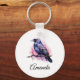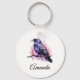 A keychain with an image of a black crow with purple pink wings. A pink watercolor splatter behind this lovely mystical bird.