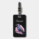 A luggage tag with an image of a black crow with purple pink wings. A pink watercolor splatter behind this lovely mystical bird.