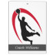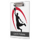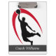 This is a clip board that is perfect for a coach, player, or basketball fan. It features a silhouette basketball player in process of dunking the ball, with a bright red swirl design behind him. A dark grey name banner holds your personalized text. Both the front and back have the same image. *Clip art used in this design is copyrighted by Encore Software, Inc., which permits use to its licensors. All rights reserved.