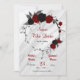 black and red flowers with grey leaves and silver glitter botanical wreath against a marble background save the date invitation