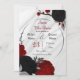 black and red flowers with grey leaves and silver glitter on a silver grey geometric frame against a marble background save the date invitation