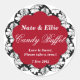 Black & redScallop Damask Candy Buffet Sticker. Great for birthday parties, Weddings, baby showers or other events with Candy buffets! Either stick to jars or paper bags. to make them extra special, stick to some precut cardstock and add a ribbon. Then simply hang around the jar! Or stick a coffee stirrer to the back of pre-cut cardstock, add the sticker and use as a cupcake topper! Design features a black and white damask floral print on a scalloped background. layered on top of this is a matching smaller red scalloped circle with your text. Please feel free to change text and text colour how you like!