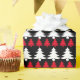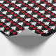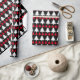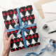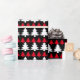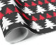 Christmas wrapping paper is shown in a black background with Red and white trees print.