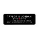 Romantic return address label in black with white arrows pointing at a red heart between your names and address. Black and white return address label for a wedding with a red accent colour. Wedding return address labels with an arrow and heart divider.
