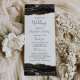 This elegant, modern wedding program features black watercolor agate top and bottom borders trimmed with rose gold faux glitter. The text appears in elegant charcoal grey handwriting and copperplate fonts on a white background.