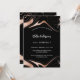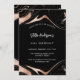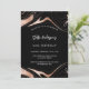 A black background. Decorated with rose gold marble veins. Personalize and add your name and party details. White text.