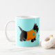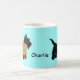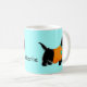 Enjoy drinking your coffee or other favourite beverage from this cute mug with a black Scottie Terrier on a turquoise aqua blue background. Personalize with your dog's name or change to your name or other words. This whimsical black Scottie Terrier is wearing an orange tee shirt with turquoise teal trim. The Scottie dog is on both sides of the mug with the name in the centre. This cute, cuddly and trendy dog is original art by Phyllis Dobbs and will melt the heart of a dog lover. This Scottie is one of a series of 6 Scotties on coordinating products and all are fully customizable to make it your own!