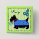 You will enjoy wearing this name badge pin personalized with your name or your dog's name. Or let your dog wear it pinned to his or her dog sweater. Show your dog love with this cute name badge with a black terrier dog and personalized with your dog's name, your name or other words. Customize the name above the art image or delete if you prefer. This whimsical black Scottie Terrier is wearing a blue sweater coat with tonal blue stars and a red collar. A lime green and turquoise ball is behind the Scottie and a large white dog bone is at his or her front paw. The background is a lime green tonal stripe pattern. A serpentine line border surrounds the dog image to make a stylish, trendy and custom name badge pin. Three turquoise teal blue flowers are above the dog. This cute, cuddly and trendy dog is original art by Phyllis Dobbs and will melt the heart of a dog lover. This Scottie is one of a series of 6 Scotties and all are fully customizable to make it your own!