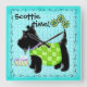 Show your dog love with this cute wall clock with a black terrier dog and personalized with the words "Scottie time" or your dog's name or other words. Customize the words above the art image or delete if you prefer. This whimsical black Scottie Terrier is wearing a green check sweater coat with a lavender collar. A lime green and lavender dog food dish with dog bones is in front of the Scottie. The background is turquoise aqua blue with turquoise tonal check pattern. A serpentine line border surrounds the dog image to make a stylish, trendy and decorative wall clock. Three lime green flowers are above the dog. This cute, cuddly and trendy dog is original art by Phyllis Dobbs and will melt the heart of a dog lover. This Scottie is one of a series of 6 Scotties and all are fully customizable to make it your own!