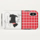 This chic phone case features a cute black Scottish terrier wearing a red and white plaid bandana. Text reads "Love My Scottie". Above is a red and white plaid pattern to match. Perfect for Scottie dog lovers! Designed by artist © Tim Coffey.