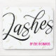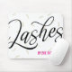 Stylish mouse pad for a lash artist in an eye catching design with a lash pattern in gold. Lashes written across in a black swirly script. Personalize with your name in bold hot pink letters.