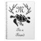 Sea turtle swimming in a tribal silhouette style. While the original was a based of an green tortoise, the shape of the segments bagging to be twisted and turned. Above the shell to the left and right is black seaweed leaving space for text, default is a letter "M" m is short for monogram. And below the turtle are water swirls.
