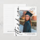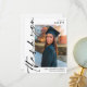 Elegant photo graduation thank you card personalized with a photo of the graduate on one side with thank you in a black signature script down the left side of the flat thank-you card. Double-sided graduation thank you card printed a photo on one side and a lined note card on the other to write your thank you note by hand.
