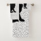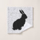 This set of bath towels that includes a wash towel, hand towel, and bath towel are white with black polka dots and the side profile of a sitting black silhouette rabbit. Purchase the whole set or individually.