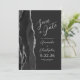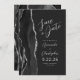The left-hand edge of this elegant modern wedding save the date card features a black watercolor agate border trimmed with faux silver glitter. The customizable text combines silver grey script and sans serif fonts on a slate black background. The reverse side features a matching black and silver agate design.