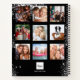 Make your own unique family photo collage as a gift or for yourself. Use four, 9 of your favourite photos of your family, friends, dream travel destination or pet! Personalize and add a name and a year. The name is written with a modern hand lettered style script. A modern black background, decorated with faux silver glitter dust.
