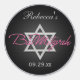 This 1.5" diameter black, silver and pink Bat Mitzvah Star of David sticker and/or envelope seal matches the Bat Mitzvah invitation shown below. You can remove the Bat Mitzvah text and/or the silver Star of David. The other text is customizable, and you can also select the larger 3" size sticker.