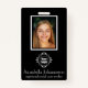 This simple and sophisticated custom ID badge features a black and white design with a solid black background and white text. A sample photo which you can replace with your own photo or image. A sample logo is printed below the photo. A name and job title are printed below the logo.