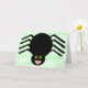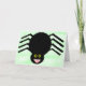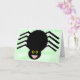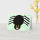 A spooky black spider with eight hairy legs, yellow eyes with big black pupils and its mouth open showing its fangs.