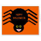 This big greeting card features a spooky black spider with eight hairy legs, yellow eyes with big black pupils and its mouth open showing its fangs. This scary spider Halloween card has an orange background.