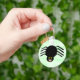 A spooky black spider with eight hairy legs, yellow eyes with big black pupils and its mouth open showing its fangs.
