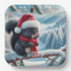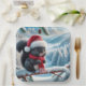 A cute squirrel wearing a Santa hat and scarf sits on a snow-covered branch