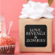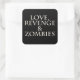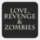 Black square sticker with "Love, Revenge & Zombies" on it. Set of 6 stickers.