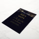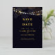 A fun and festive Save the Date featuring black background with string lights, text in Gold Foil.
