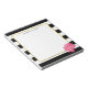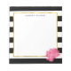 Chic personalized notepad features a crisp black and white stripe background, faux gold foil border, and a vibrant pink watercolor peony flower. Customize with a monogram, name or text of your choice.