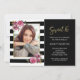 This black and white striped sweet 16 birthday invitation also features some watercolor raspberry coloured floral arrangements. The heading is in a faux gold foil finish. The photo appears on the left hand side of the design in a faux gold foil border frame. More designs in this colour scheme are available at the store. This balck white striped and floral sweet 16 birthday invitation is ready to be personalized.