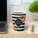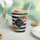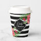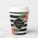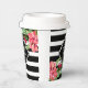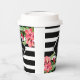 Black and white geometric stripes and pink exotic flowers. Customizable paper cup template