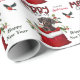 The repeated pattern on this cute Christmas wrapping paper is an image of a black and tan Dachshund dog peeking out from a red and white Holiday gift bag. Behind him is a sprig of holly and red berries. A red and black bullfinch bird is about to land. Stylized red and black buffalo plaid text says MERRY CHRISTMAS", and "Happy New Year" is in dark green. Your own signature is in two fields for you to customize.