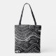 This stylish black tote bag features a striking white abstract pattern, including various shapes and lines such as wavy lines, zigzags, dots, and eye-like shapes. The intricate design creates a visually appealing and unique accessory. The black handles provide a comfortable and sturdy grip, making it ideal for everyday use, shopping, or as a thoughtful gift for friends and family.