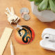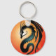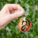 This black tribal dragon sits on a bright red and yellow background. The sun appears just behind the dragon’s head that is facing down in an elegant pose. The serpent’s body snakes up and then curves back down with it’s large black wings extending outwards. This stunning pattern makes a beautiful keychain.