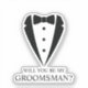 featuring a black tuxedo suit and bow tie illustration, with the groomsman’s name and a proposal message in a classic serif font.