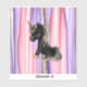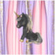 Cute black magical watercolor unicorn with pastel pink ears and ombre gold and black mane and tail set on a fantasy curtain of purple and pink shades of color with gold accents. A colorful and unique addition to a unicorn party.