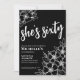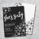 Elegant Sixty Black White 60th Birthday Party Invitation. A fun but elegant 60th birthday party invitation with girly black and white flowers for the young at heart. A playful flower pattern frames a script typography "she's sixty" mixed with a more classic serif font. Celebrate sixty years of life with this beautiful botanical design. The fun part is you can change out ALL of the colours!! You can not only change the background colours and font, but you can change the lines for the flowers as well.