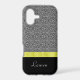 The abstract black and white optical design on the upper two thirds of this case, paired with the black bottom third and a gold ribbon separating the two makes a uniquely elegant case! Add your own name as personalization, and the package is complete. **Please note: the image is printed on the case and contains no actual fabric or ribbon.**