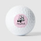 This customizable golf ball features a black and white golf cart, plus a customizable name to personalize on a pink background. It's a stylish accessory that would be a good gift for any woman who plays golf.