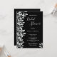 A trendy bridal shower invitation in black and white. A chic black background on the front. Decorated with botanical silver and white coloured sprigs and foliage. Modern large handlettered script, typography with the text: Bridal Shower. Templates for the bride to be's name and party details. White text.