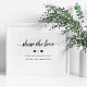 Our simple and elegant hashtag sign lets guests know about your custom wedding hashtag for social media sharing. Personalize the header and hashtag (shown with "Share the Love") in crisp black calligraphy script and classic block lettering. Includes two social media icons joined by a heart.