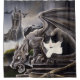 Black and white tuxedo kitten is sitting beside a gargoyle. Behind them is a castle and dragons.