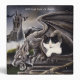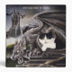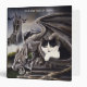 A black and white tuxedo kitten is sitting with a gargoyle, Behind them is a gothic castle with dragons.
