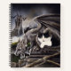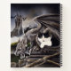Black and white tuxedo kitten is sitting beside a gargoyle. Behind them is a castle and dragons.