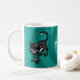 A customizable mug featuring featuring a cartoon black and white cat wearing 2 pairs of roller-skates, black and white stripey socks and a safety helmet on a teal green background.