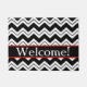 Make a fashion statement at your door when welcoming people to your home with this door mat with a sophisticated black and white chevron zigzag design and the word "Welcome". The word can be changed by customizing to your own greeting or name. Great for the door to your office as well. The Chevron ziz zag graphic design is one of the hottest art and design trends, and is extremely popular from fashion to home decor. This sophisticated black and white chevron rug has a black strip with red edges for the word Welcome or your own word. Easy to customize!