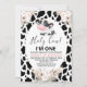 Cute holy cow themed birthday invitation for a little girl in a bohemian style featuring a cute black and white cow, some sweet boho floral arrangement with pampas grass, and white orchards, and a black cowhide pattern background. This design is suitable for any age.