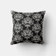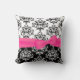 Lovely damask print decorator throw pillow done in black and white. Graphic printing of a pink ribbon and bow, stretches across the middle front of the pillow. Elegant pillow for any room of the house or office.