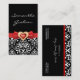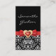 Black white damask pattern with red bow and jewel business card template that features a black and white damask pattern and a red ribbon across it with a bow and a heart shaped jewel also in red with gold outline and strass which adds a little bling. Note the bow and the heart diamond jewellery is a "printed on" illustration and not a real crystal, so are the strass. An elegant and stylish feminine business card design. Trendy, fashionable and modern perfect for professional or personal use.
