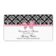 Black, White Damask Water Label Pink Bow